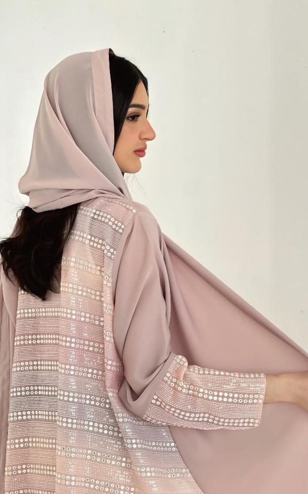 عباية أنيقة مصنوعة من قماش الكريب الوردي المتميز، تضفي إطلالة راقية ومريحة. يتميز ظهر العباية بتصميم فاخر من قماش هندي مطرز ناعم، يعكس جمال التفاصيل الدقيقة والحرفية العالية. تأتي العباية مع طرحة مصنوعة من قماش الليزر، مما يمنحها لمسة عصرية وأنيقة تتناسب مع جميع المناسبات.